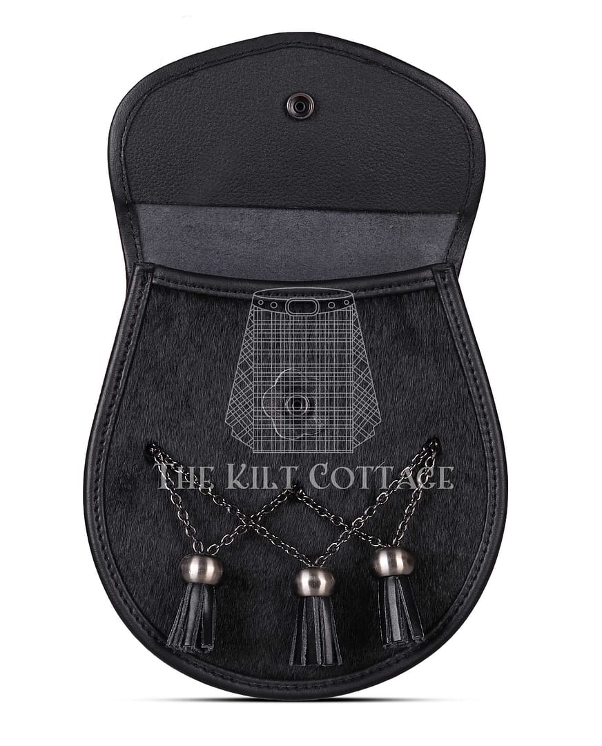 Crafted from premium black leather and fronted with genuine bovine fur, this sporran offers a bold, textured contrast that commands attention. The natural grain of the fur ensures each piece is slightly unique, adding character to your Highland attire.