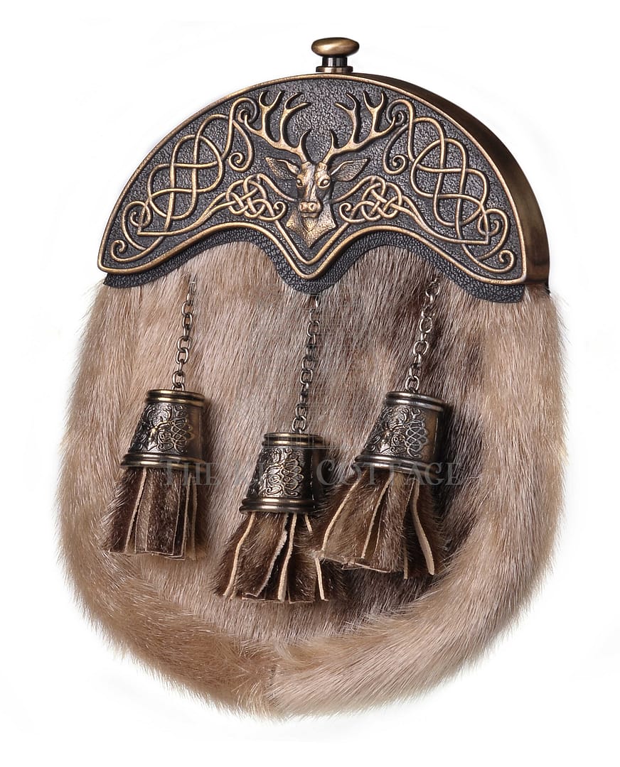 The centerpiece of this sporran is the solid brass cantle, featuring a finely detailed stag head emblem—a powerful Celtic symbol of pride, resilience, and Highland nobility. Three matching seal fur tassels hang from traditional leather cords, swaying gracefully with movement and completing the time-honored full dress look.