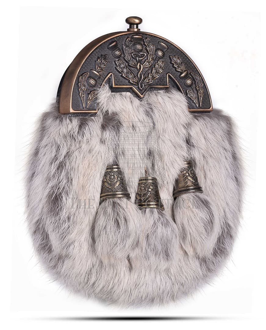Artisans carefully handcraft this sporran using semi white rabbit fur, which offers a soft texture and a naturally mottled blend of white and light grey tones. The fur’s soft, subtle pattern makes each piece unique while adding gentle contrast to any tartan. Whether paired with a light or dark kilt, this sporran enhances your outfit with grace and heritage.
