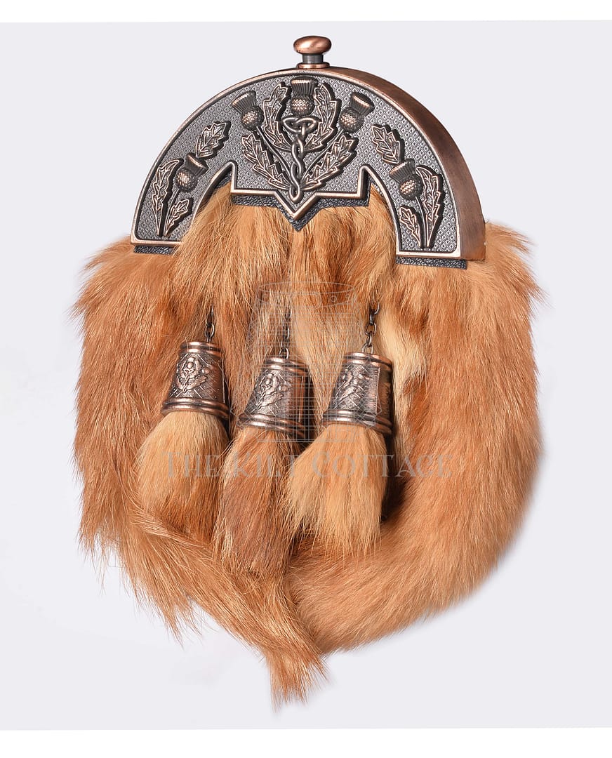 The top of the sporran shows a solid bronze cantle that holds a raised Scottish thistle emblem. The thistle represents resilience, pride, and Highland tradition. Craftsmen shape and finish the cantle to give it a warm, antique bronze tone that enhances the fur’s richness. Below the cantle, three red fox fur tassels hang from strong leather cords. These tassels swing gently as you move, preserving the sporran’s classic Highland form.