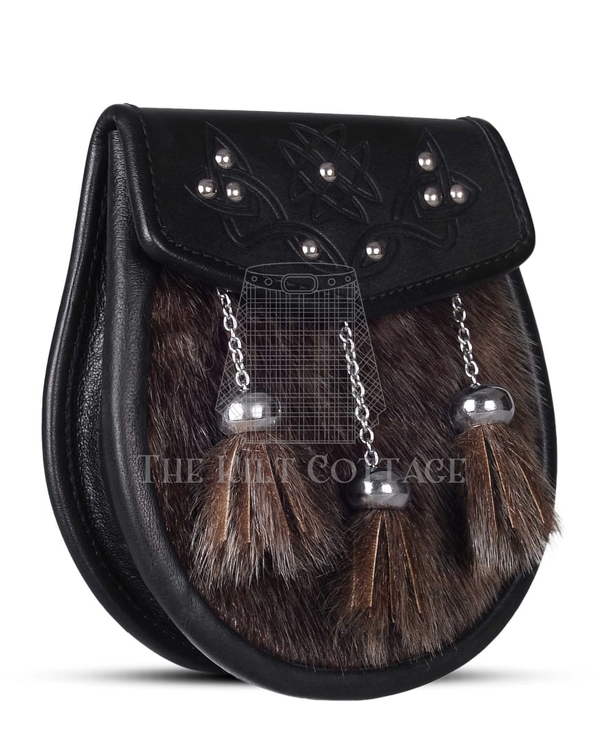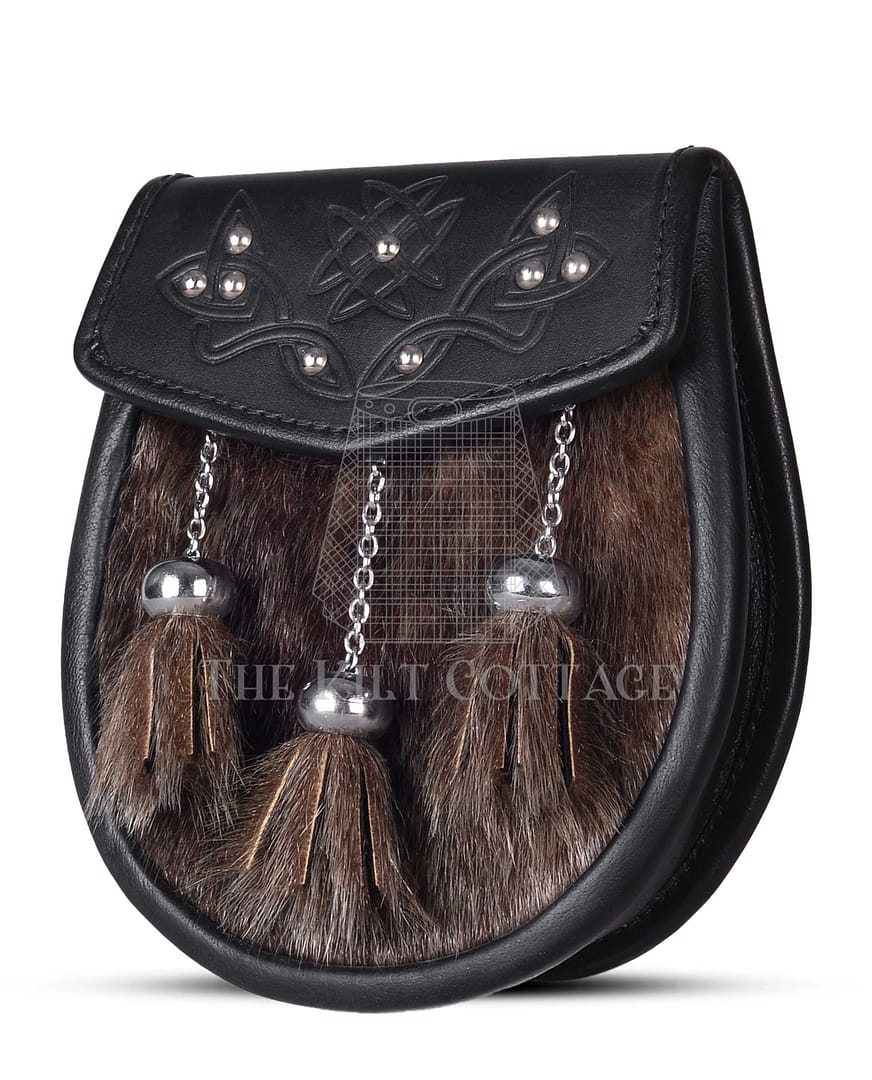 Made from premium brown leather, this sporran offers both durability and a warm, natural tone. The flap features a detailed embossed Celtic design, adding symbolic richness and a touch of artistry to the overall look. Below the flap, a soft panel of genuine seal fur gives the sporran a sleek, polished finish with subtle texture contrast.
