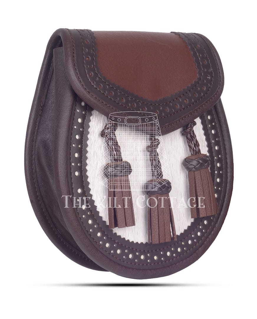 It attaches easily to your kilt using the included adjustable leather and chain belt, offering a comfortable and secure fit. The neutral tones of brown and white make it highly versatile, pairing effortlessly with most kilt colors and tartans.