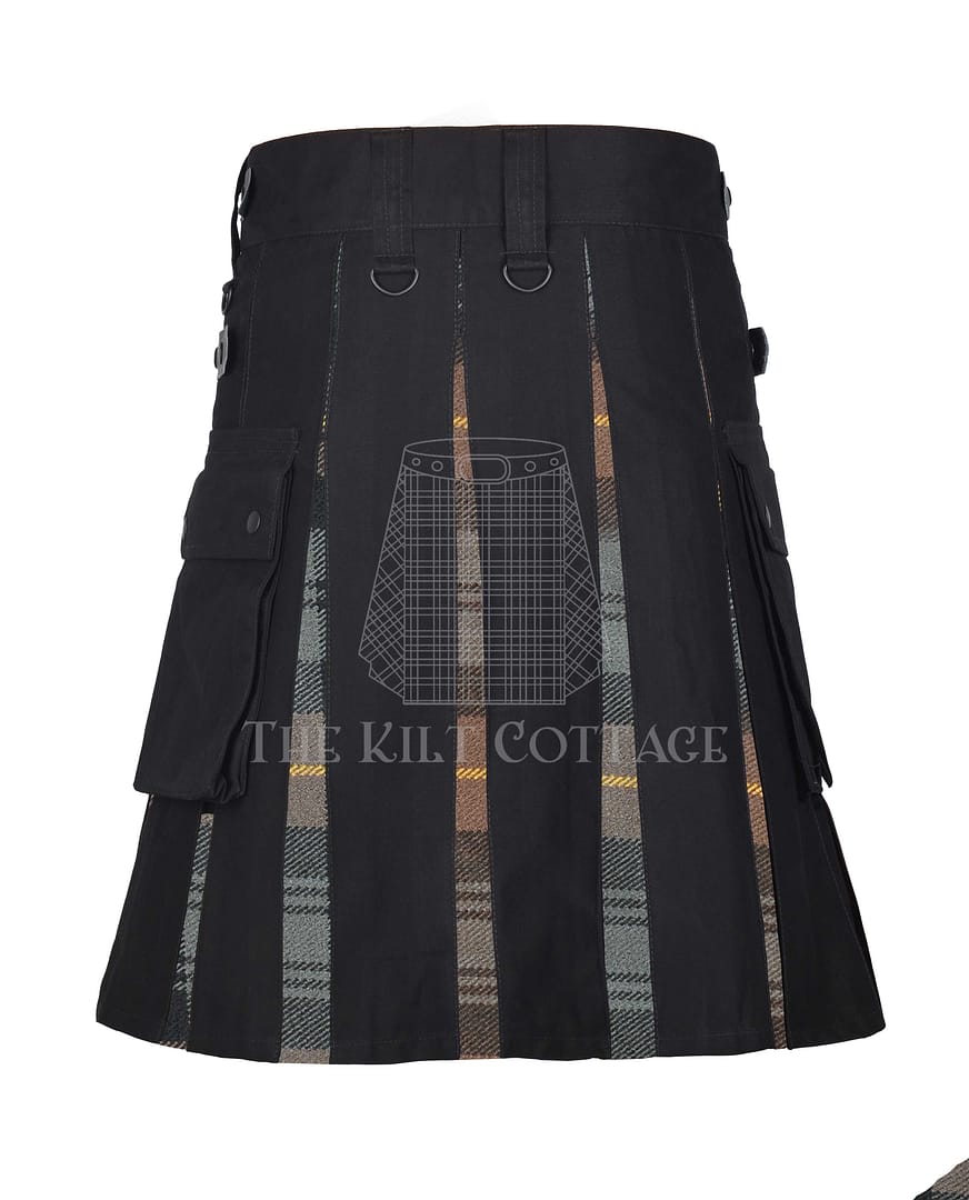 Crafted from durable, breathable cotton, the kilt provides strength and all-day comfort. Its solid black front panel adds structure and balance, while the rear pleats proudly display the Gordon Weathered tartan, a muted blend of earthy greens, browns, and greys that reflect the rugged Scottish Highlands.