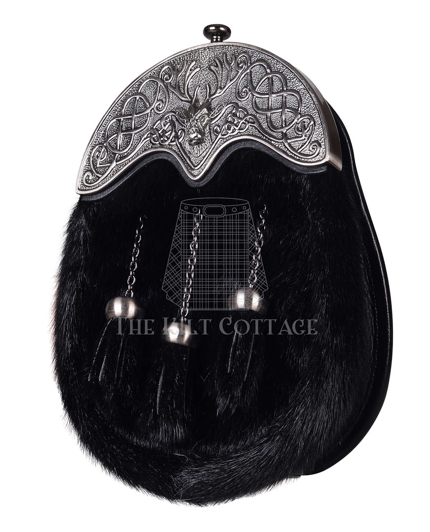 Nickle Brushed Stag Head Black Seal Fur Full Dress Sporran