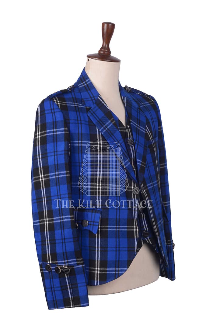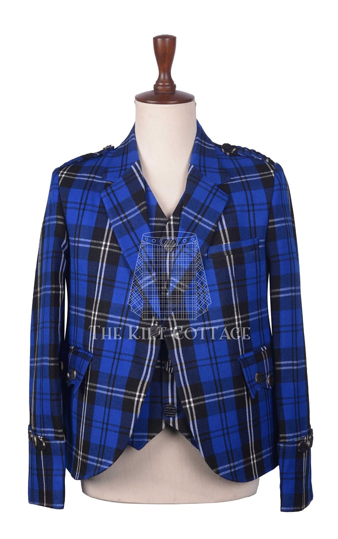 The jacket features the iconic Ramsay Blue Hunting Tartan, known for its deep blues, forest greens, and subtle blacks—creating a rich, earthy palette that reflects the spirit of the Scottish Highlands. Designed in the classic Argyll style, the jacket includes a gauntlet cuff, braided epaulettes, and silver-tone buttons for a polished finish. Its single-breasted front and shorter cut make it perfect for pairing with a kilt and sporran.
