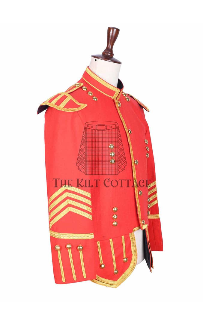 Embrace the strength and elegance of Highland tradition with the Scottish Red Gold Military Doublet Jacket. Designed to reflect the proud heritage of Scottish military dress, this striking jacket delivers both historical charm and contemporary craftsmanship—ideal for formal events, parades, weddings, and pipe band performances.