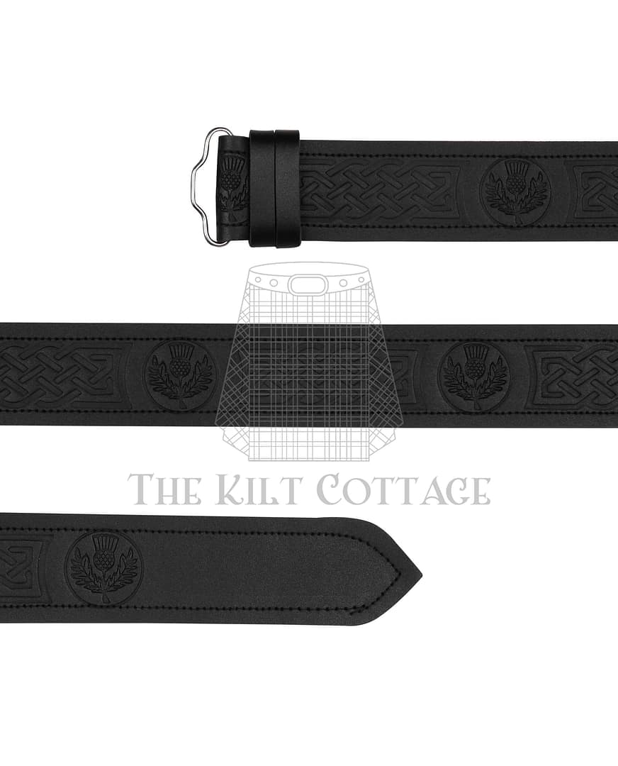 The surface displays deeply embossed thistle motifs. These iconic flowers symbolize resilience, honor, and Scottish heritage. The design runs across the entire belt, creating a continuous, elegant look that pairs well with any tartan pattern or jacket style.